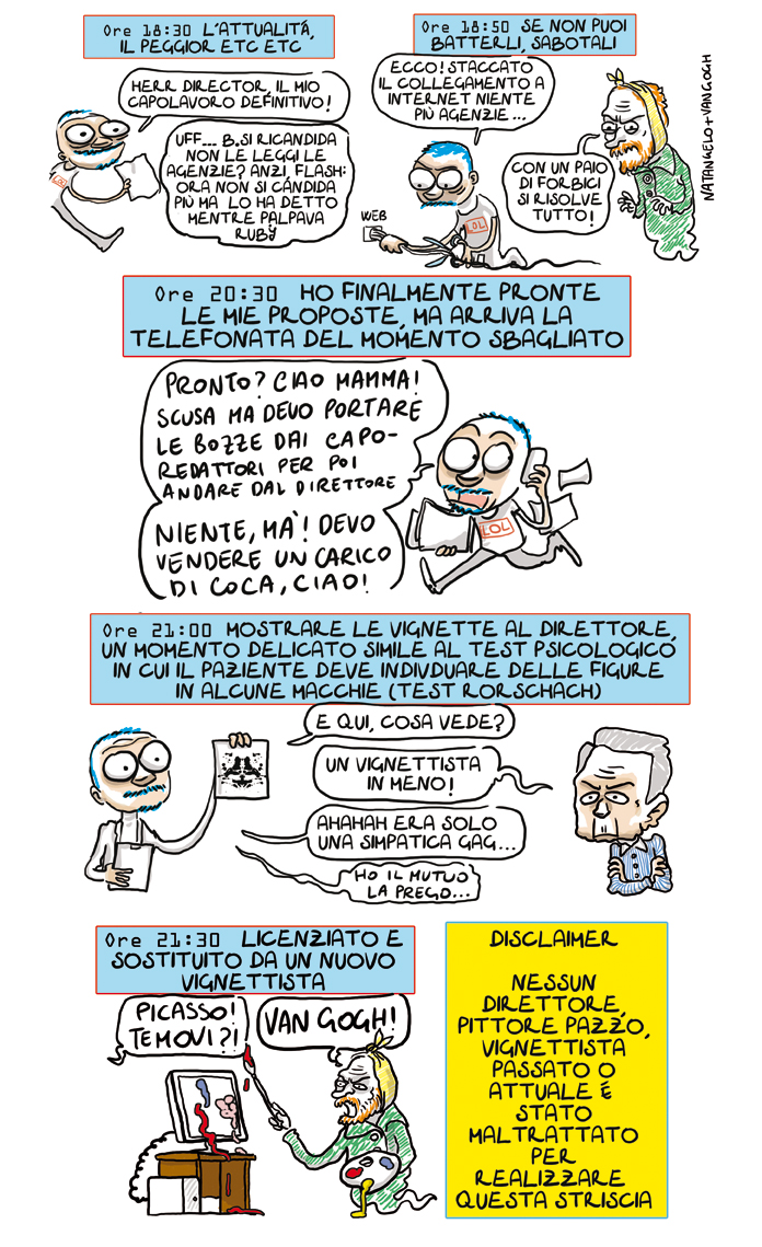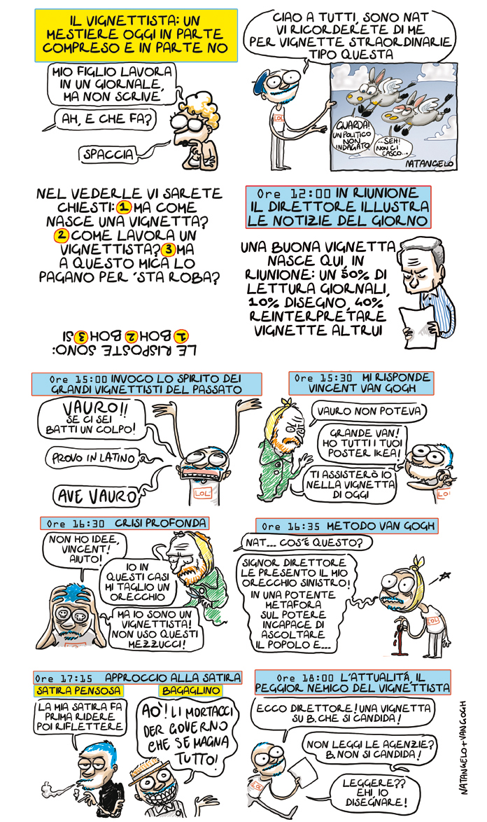 […] di Mario Natangelo | 29 ottobre 2012Commenti Come nasce una vignetta? Come lavora un vignettista in un quotidiano tipo “Il Fatto Quotidiano”?Io non lo so, perché cerco di non lavorare.Quindi ho provato a inventarmi qualcosa in un diario, ora per ora.Dalla riunione del mattino fino alla consegna della sera, passando per crisi mistiche e non e scontri con le moderne tecnologie. Qui per leggere le tavole […]